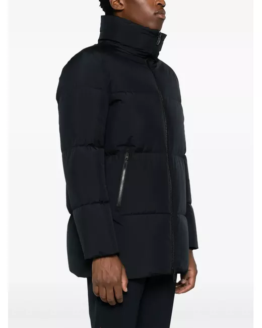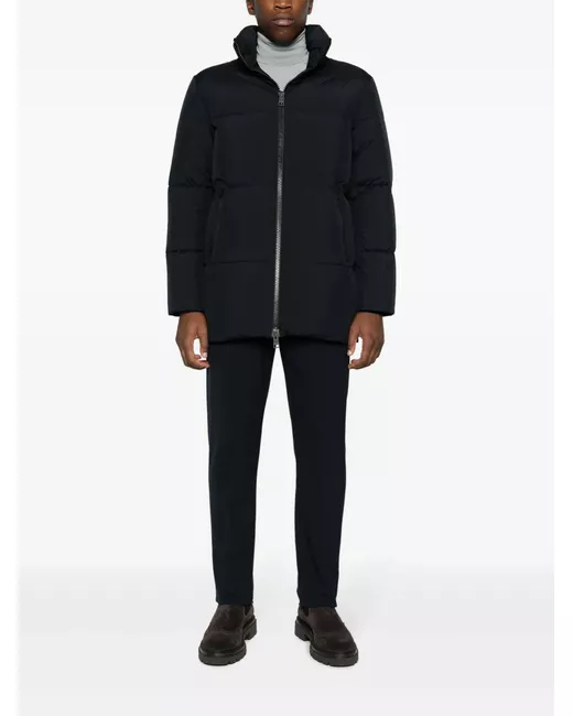 navy blue feather down waterproof GORE-TEX® material windproof padded design logo patch to the side grosgrain ribbon trim funnel neck front two-way zip fastening long sleeves front zip fastening pockets straight hem