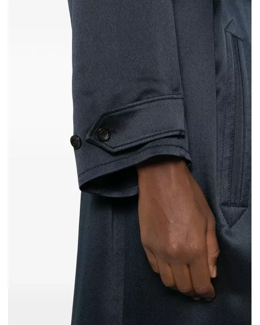 midnight blue satin finish mock neck double-breasted button fastening long raglan sleeves belted cuffs belted waist two front jetted pockets straight hem mid-length