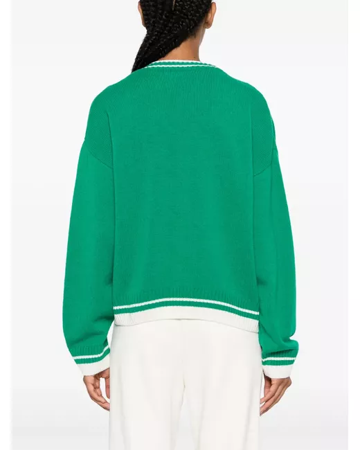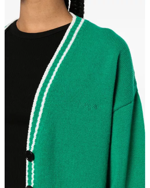 grass green/white wool-cashmere blend striped edge contrasting trim V-neck front button fastening long sleeves ribbed cuffs and hem straight hem