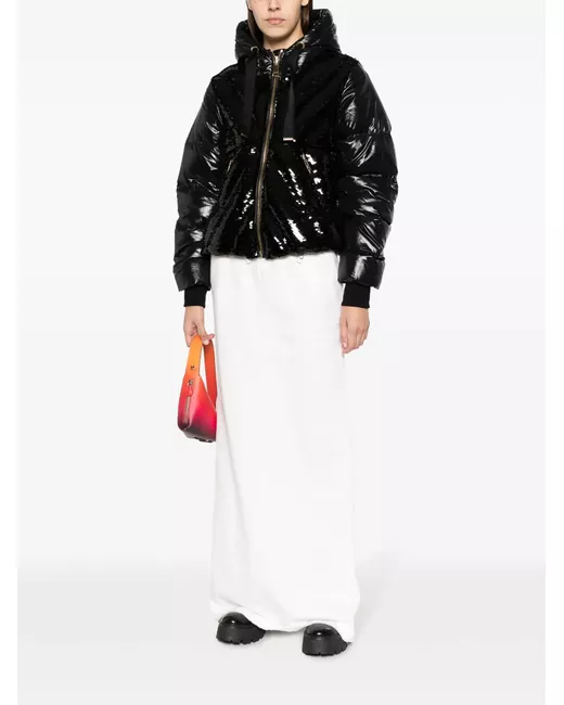 core black feather down glossy finish padded design sequin detailing drawstring hood front zip fastening long sleeves ribbed cuffs two side zip-fastening pockets straight hem