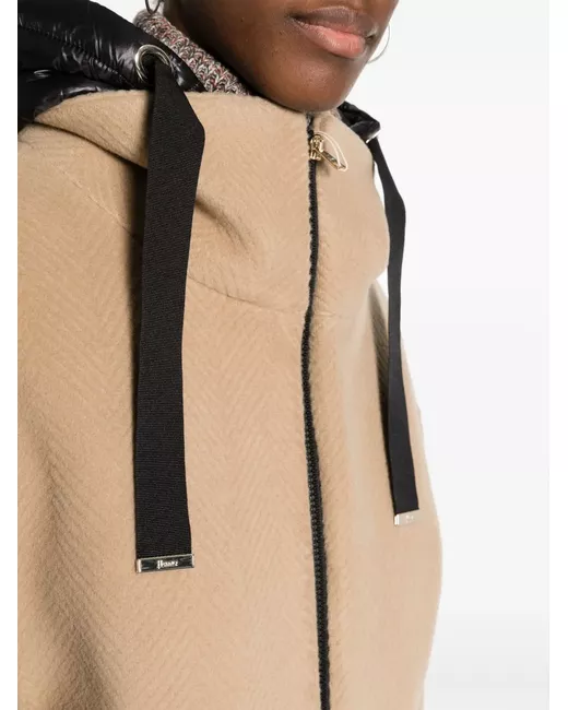 beige virgin wool front zip fastening two front welt pockets drawstring hood long sleeves curved hem
