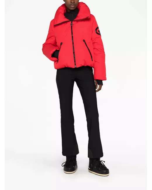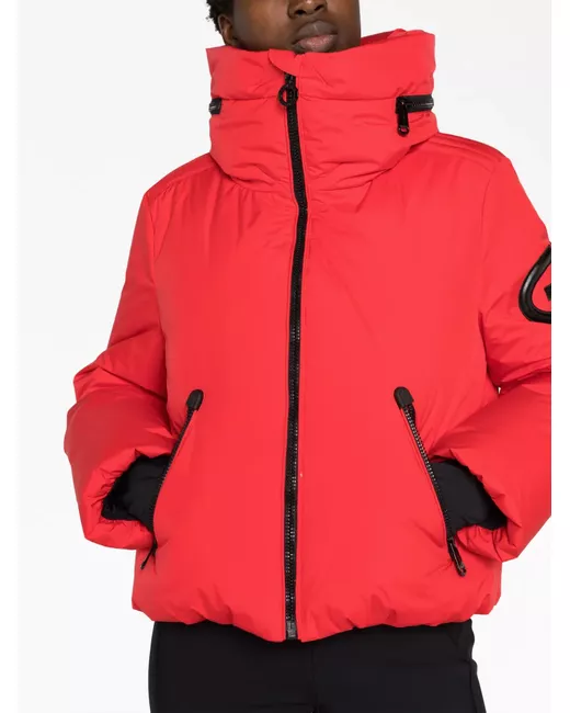 flame red feather down padded design logo patch at the sleeve concealed hood funnel neck front zip fastening long sleeves thumb slots two side zip-fastening pockets straight hem