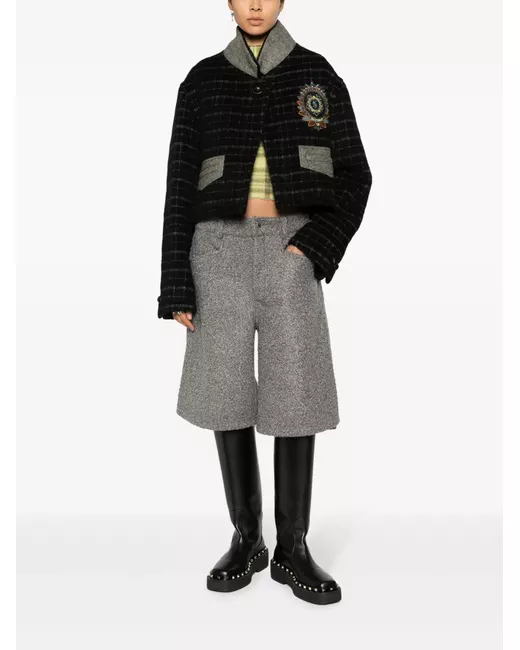 black wool blend check pattern floral embroidery to the front Chelsea collar front button fastening long sleeves two front jetted pockets straight hem cropped