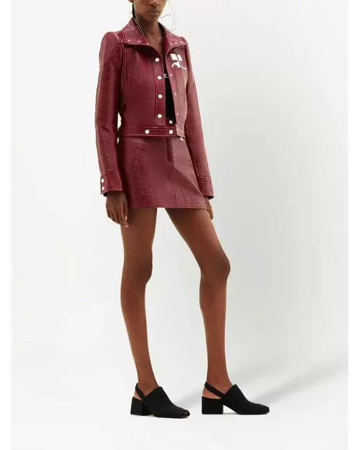 dark red stretch-cotton faux leather logo patch at the chest front press-stud fastening long sleeves straight hem