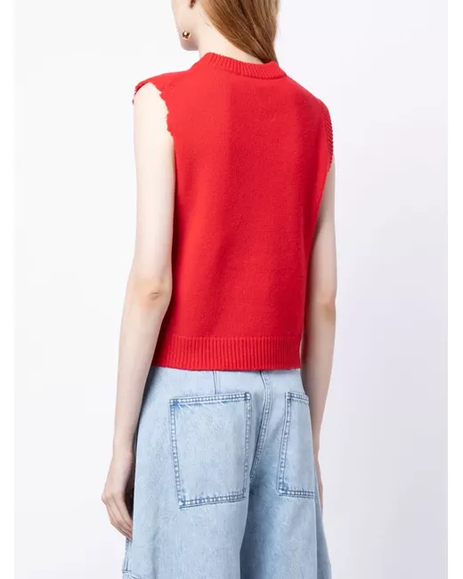 cardinal red lambs wool fine knit distressed finish crew neck sleeveless ribbed cuffs and hem straight hem