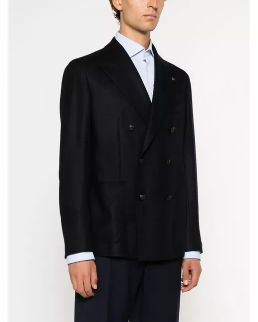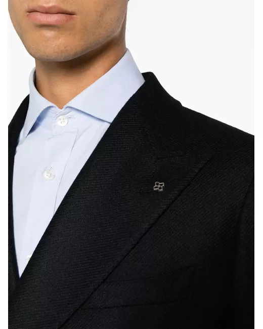 navy blue virgin wool-cashmere blend twill weave brooch detail notched lapels double-breasted button fastening long sleeves buttoned cuffs chest welt pocket two side patch pockets