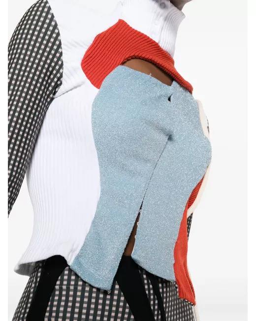 blue/white/red check print panelled design high neck contrasting-fabric sleeves asymmetric body long sleeves cut-out detailing hook fastening metallic effect panel straight hem