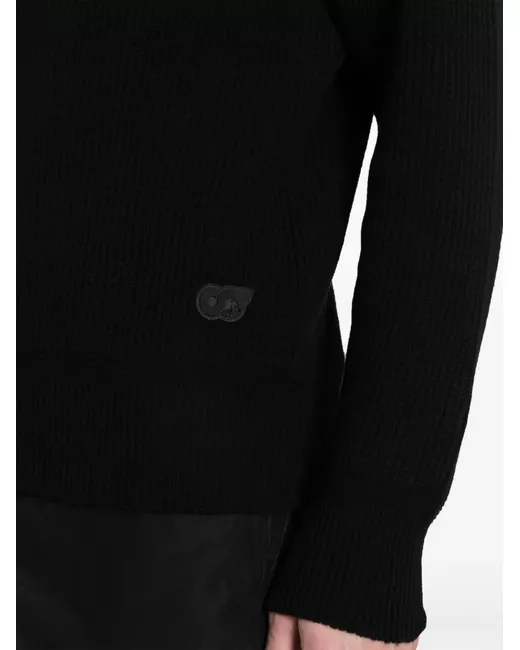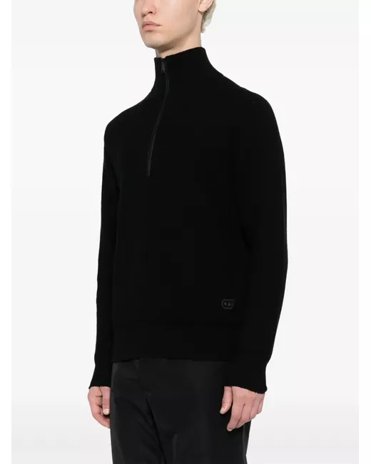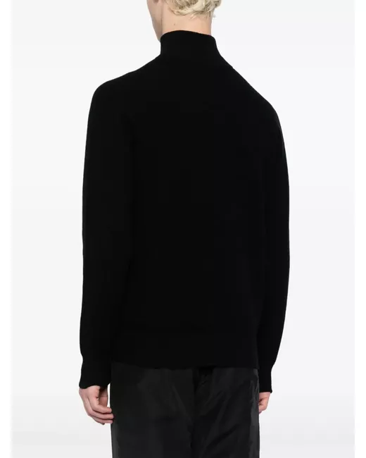 black wool chunky ribbed knit embossed logo to the side high neck half front zip fastening long sleeves straight hem