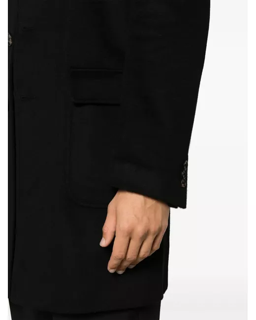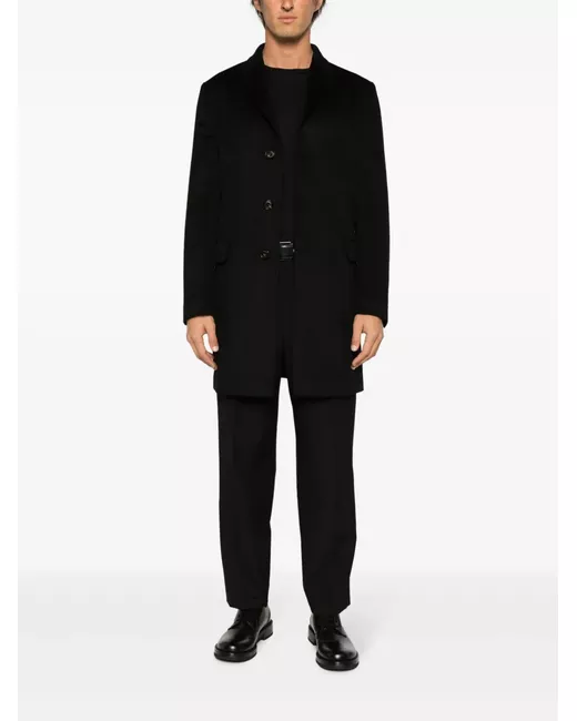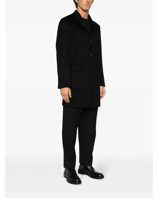 black cashmere notched lapels front button fastening long sleeves two front flap pockets straight hem
