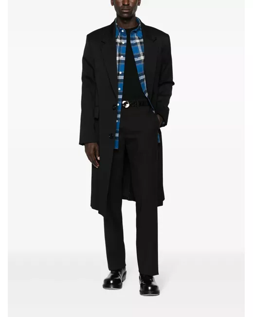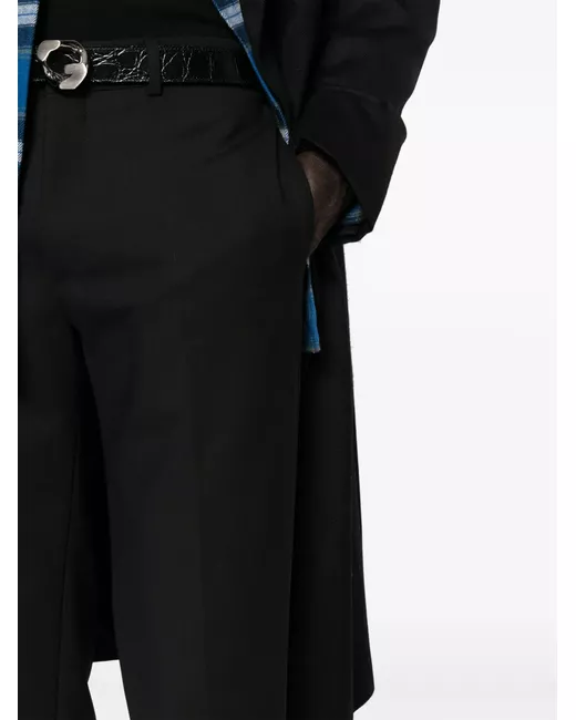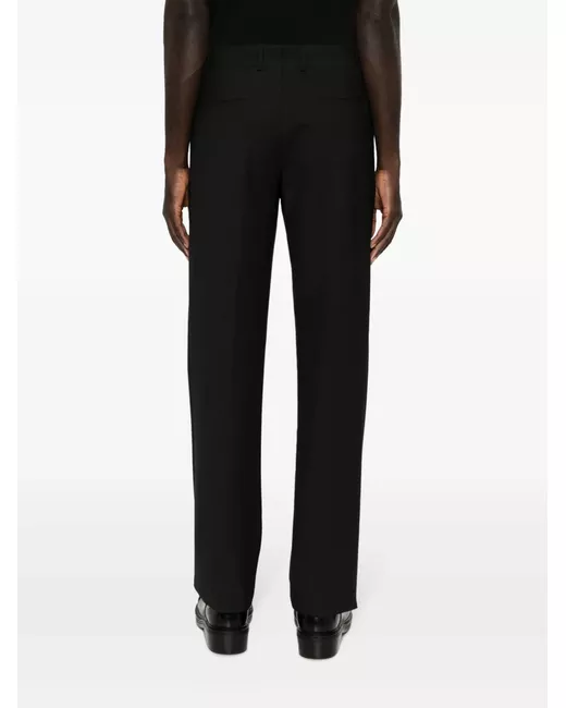 black mid-rise belt loops hook and zip fly fastening two side slash pockets two rear welt pockets straight leg pressed crease