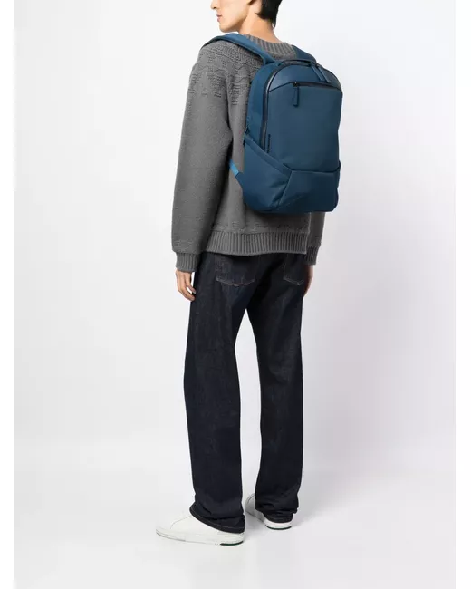 navy blue recycled polyester waterproof panelled design silver-tone logo lettering embossed logo to the rear logo-embossed strap flat top handles two padded adjustable shoulder straps all-around zip fastening slip pockets to the sides front zip-fastening pocket main compartment internal zip-fastening pocket