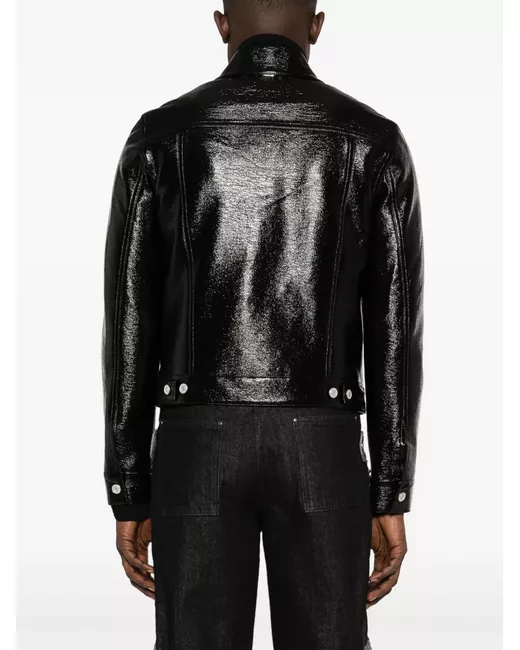 jet black cotton blend faux leather high-shine finish embossed silver-tone buttons classic collar front button fastening two chest patch pockets two side slit pockets straight hem