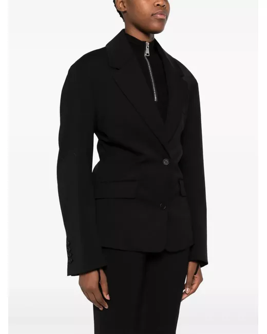 black virgin wool blend stretch-design notched lapels long sleeves buttoned cuffs front button fastening chest welt pocket two front flap pockets straight hem tailored design full lining