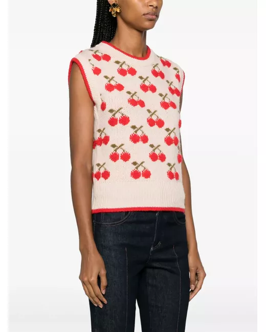 ivory white/poppy red knitted construction patterned intarsia knit sleeveless ribbed contrasting trim straight hem
