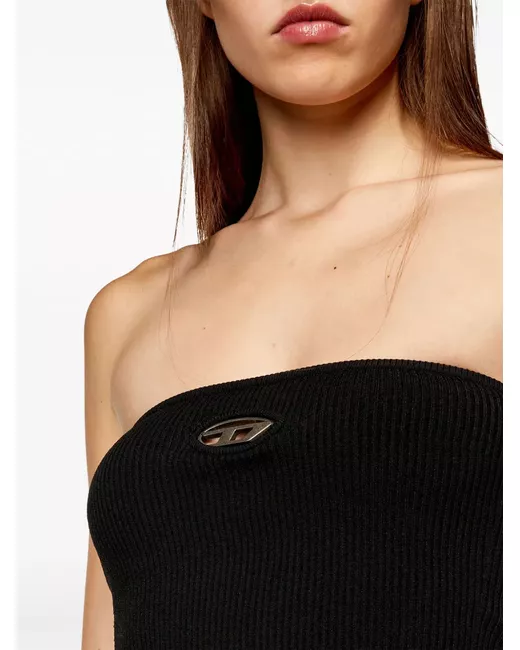 black ribbed knit silver-tone logo plaque strapless straight hem cropped