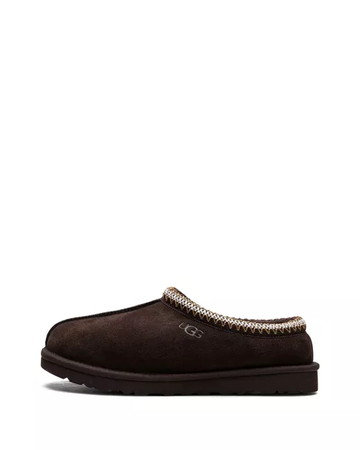 chocolate brown suede sheepskin shearling lining branded leather insole decorative stitching debossed logo to the side round toe slip-on style flat sole