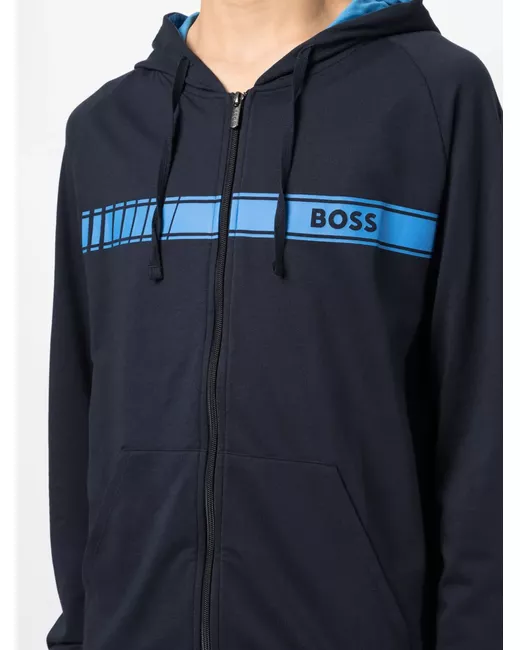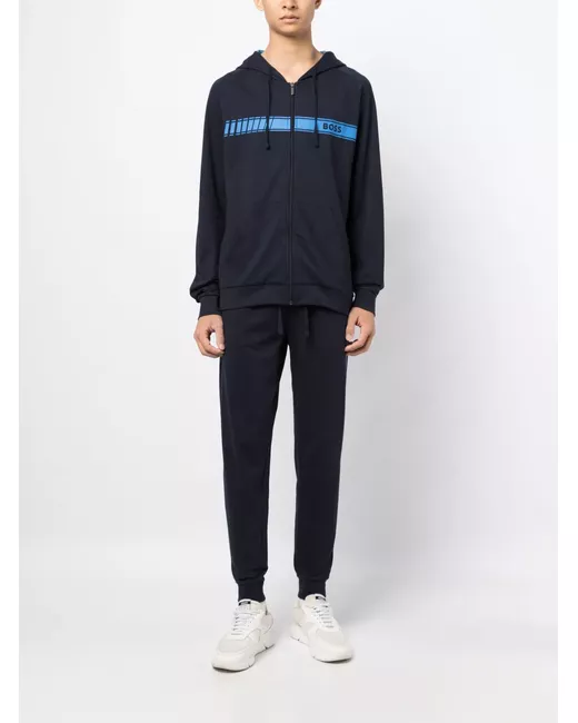 navy blue cotton logo print to the front drawstring hood front zip fastening long sleeves two front pouch pockets straight hem