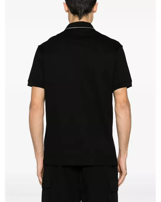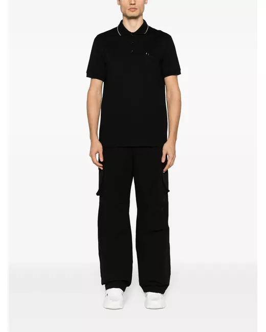 black cotton piqué weave sequin embellishment metallic threading logo-engraved buttons polo collar short sleeves ribbed cuffs front button placket straight hem authenticity QR code