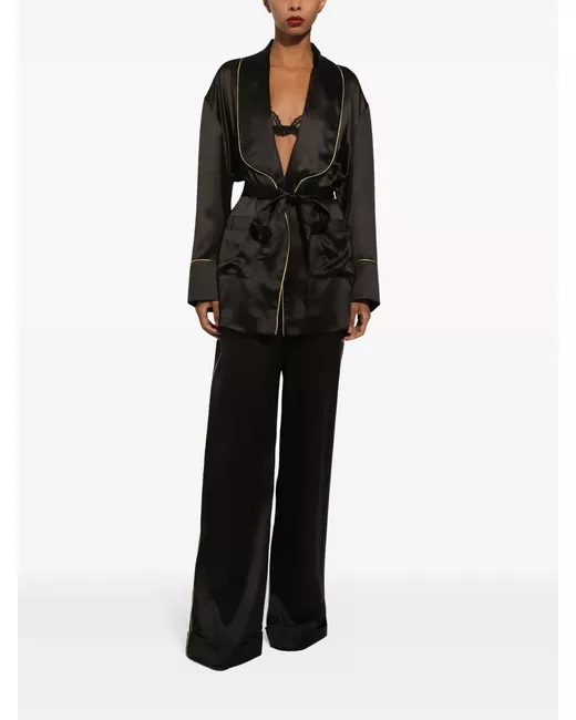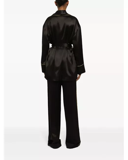 black silk belted waist two front patch pockets shawl lapels long sleeves piped-trim detailing