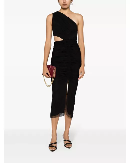 black cut-out detailing ruched detailing ruffled detailing one-shoulder front slit straight hem