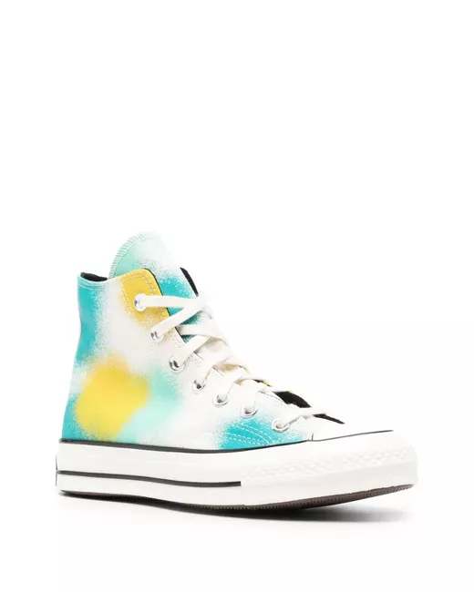 white/multicolour canvas spray-paint effect logo patch to the side round toe front lace-up fastening branded insole flat rubber sole