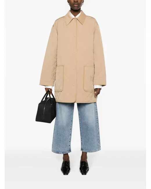 sand beige organic cotton-recycled polyester blend shell diamond quilting embroidered logo to the front corduroy detailing corduroy collar front press-stud fastening drop shoulder long sleeves two front patch pockets straight hem thigh-length quilted lining