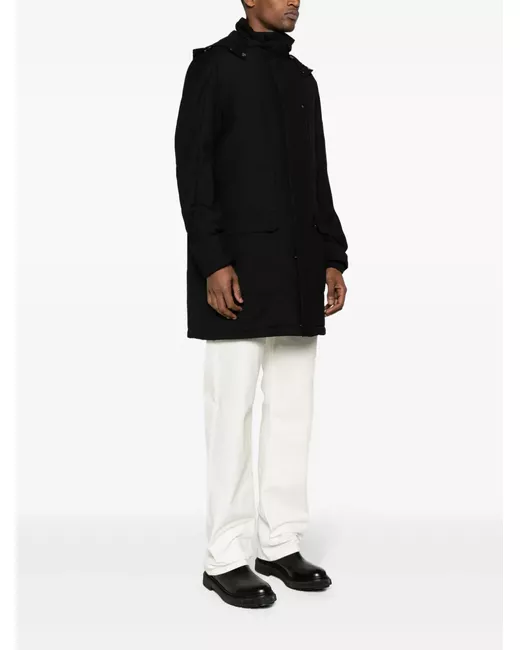 black padded design water-resistant windproof logo-engraved silver-tone hardware detachable drawstring hood high neck concealed front press-stud and two-way zip fastening branded zip pullers long sleeves elasticated cuffs two zip-fastening chest pockets two side flap pockets two side slit pockets internal drawstring fastening waist quilted lining internal zip-fastening pocket internal jetted pocket internal patch pockets straight hem