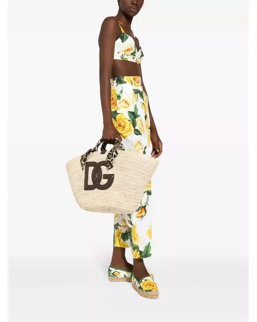 light beige leather/cotton blend interwoven design logo patch to the front two rolled top handles open top main compartment internal logo patch internal zip-fastening pocket