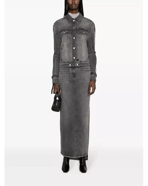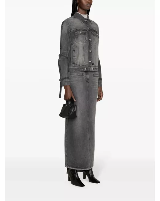 grey cotton denim stonewashed strap detailing classic collar front button fastening long sleeves two chest flap pockets two side welt pockets waist tabs straight hem