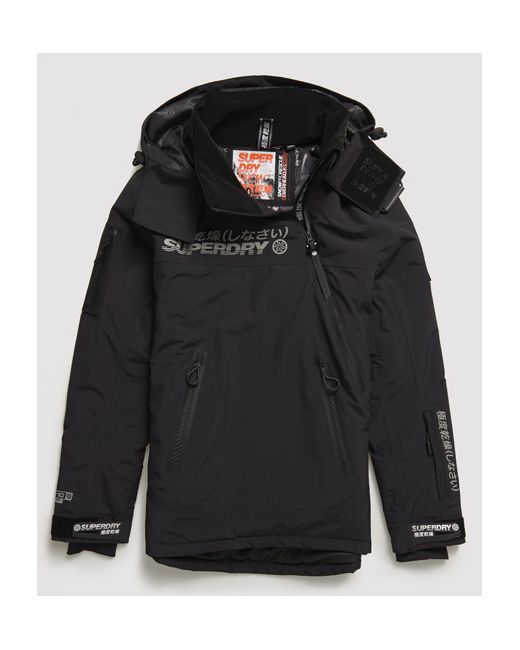Superdry men's Snow rescue overhead jacket. This snow jacket features a half zip fastening, drawstring adjustable hood, a seam zip for comfortable sitting, zip fastened underarm ventilation, anti scuff material on the back, hook and loop collar fastening, and adjustable powder skirt. The jacket also benefits from a zip fastened pocket on the sleeve, large pouch pocket with zip fastenings, and a smaller inside pouch pocket with media outlet and a cloth to clean your goggles. The Rescue overhead jacket is finished with hook and loop adjustable cuffs, cuff linings with thumbholes, Superdry logos on the chest and back, and Superdry badges on one sleeve. Water resistance