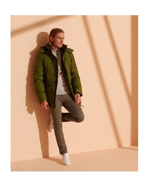 Be the best you can be on the slopes this season with the Expedition Down Parka Coat, designed to keep you dry and warm with it's 90/10 down filling. Bungee cord adjustable hood Removable hood Zip and popper fastening Eight external pocket Single inner pocket Bungee cord adjustable waist Ribbed cuffs Bungee cord adjustable hem Signature logo badge Signature logo patch 90/10 Down filling Superdry is certified by the Responsible Down Standard to confirm that our down filled products are sourced to ensure animal welfare.