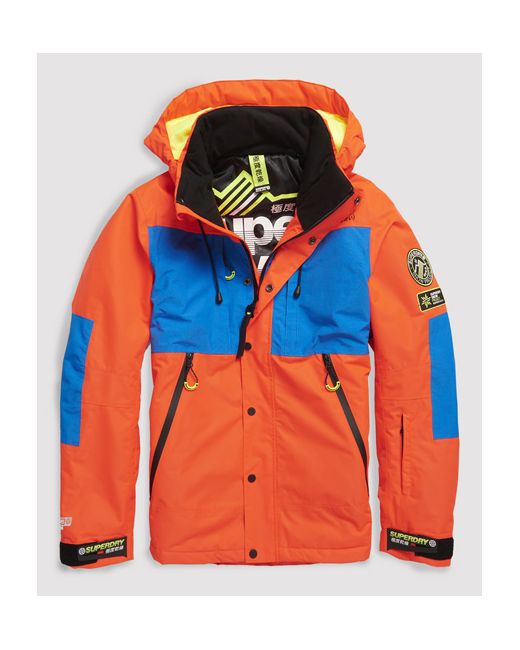 Superdry men's SD Mountain jacket. This ski jacket is far from short of your slope essentials this season, with fastenings all over to ensure the snow stays out the heat stays in. This includes, zip and popper main fastening right up to the neck, snow cuff around hips, drawstring neckline and hood, hook and loop adjustable cuff and inner sleeve lining with thumb-holes. There is no shortage of pockets either, with two large front pockets, two breast pockets, a sleeve pocket, one inside mesh pocket and a single inside pocket with a headphone cable port for your entertainment. Added features include ventilation under the arm and a detachable goggle cleaner. Superdry rubberised logos sit on the back, sleeve, front and cuffs. Water resistant rating: Up to 10K/MM
