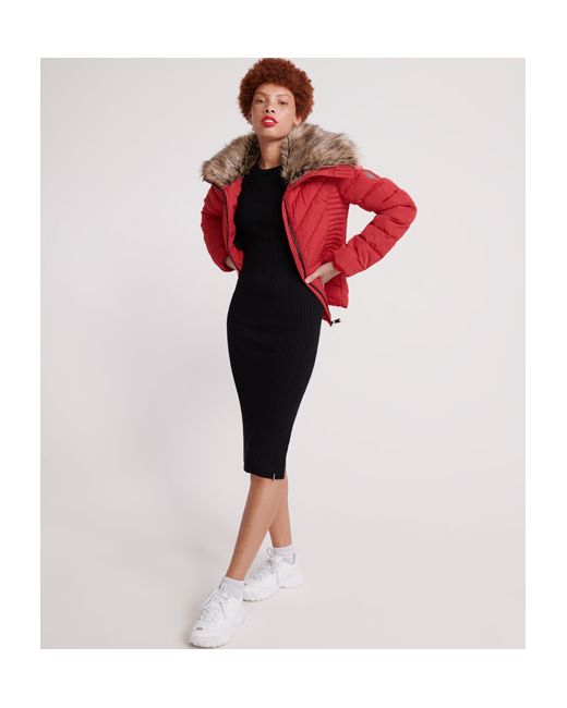 Superdry women's Arctic Glaze jacket. A stylish update to your outwear collection this season. Our Arctic Glaze jacket features a main zip fastening, zip pockets and a faux fur collar that zips up. Completed with a metal Superdry logo badge on the sleeve. Pair this padded jacket with jeans and boots for a stylish winter look.