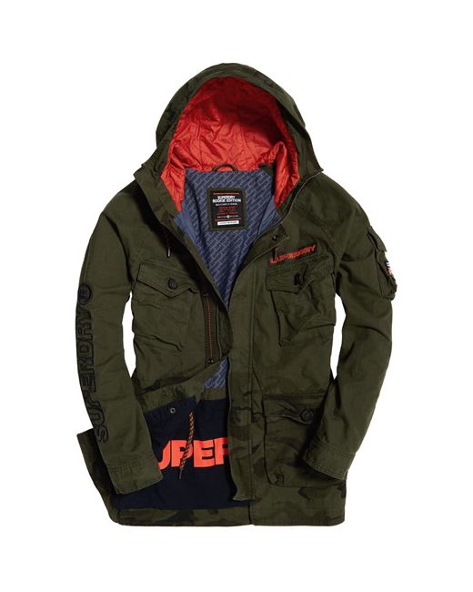 Superdry men's mixed Rookie parka jacket. This jacket features a main zip and popper fastening, six front pockets and one pocket on the sleeve, drawstring adjustable hood and popper fastened cuffs. This jacket also features an embroidered Superdry logo down one sleeve, a textured Superdry logo on the chest and an adjustable drawstring waist. Finished with a Superdry logo badge on the sleeve pocket and Superdry logo tab on one of the front pockets.