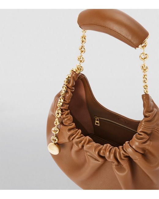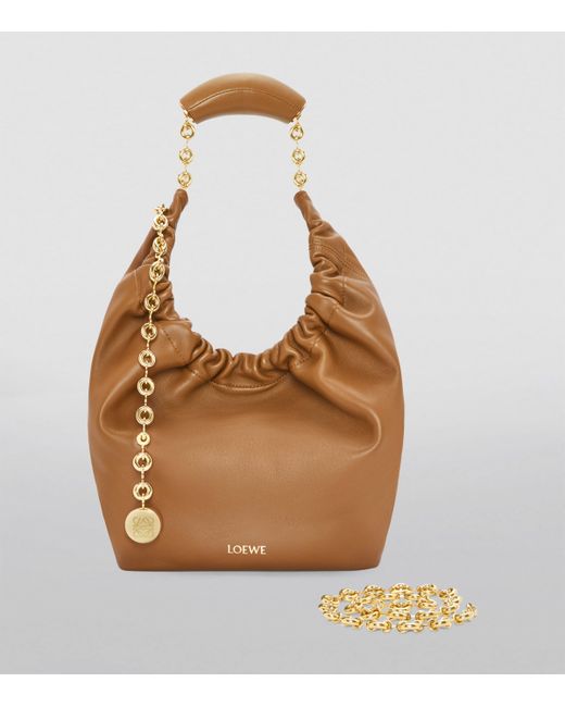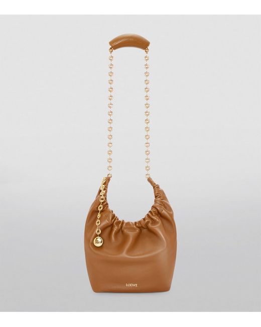 For the Autumn/Winter 2023 collection, LOEWE introduces the new Squeeze silhouette, crafted from buttery nappa lambskin and gathered along a doughnut-shaped handle for a design that looks squishy and malleable to touch. A swinging ball chain creates glamorous dynamism, with a puffy leather-coated handle for comfort.