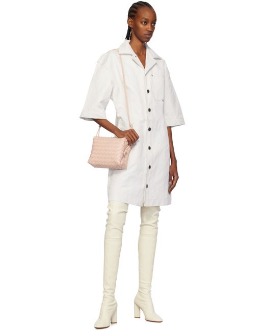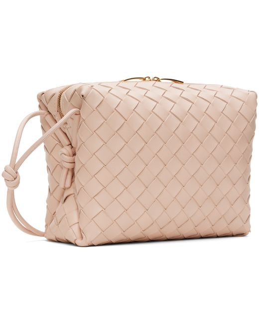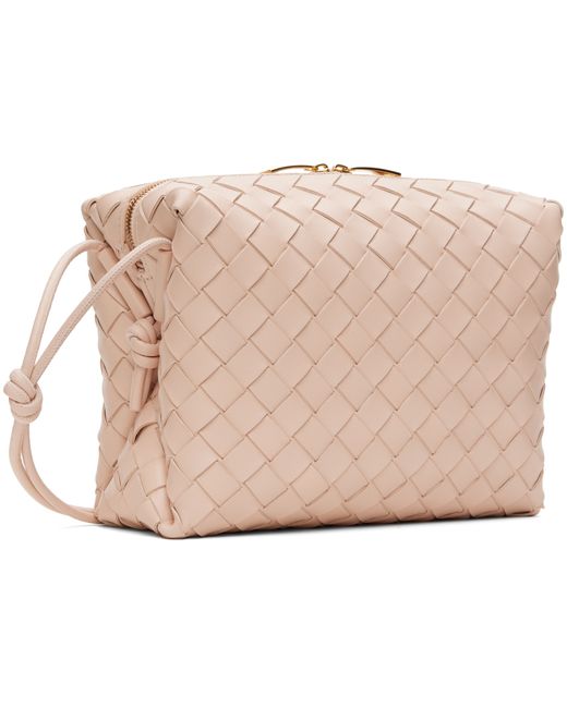 Intrecciato-woven buffed lambskin shoulder bag in pink. · Knotted accents at adjustable crossbody straps · Two-way zip closure · Bonded buffed calfskin lining · Gold-tone hardware · H6 x W8 x D3.5 Supplier color: Lotus/Gold