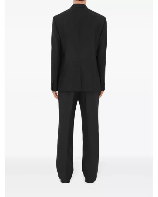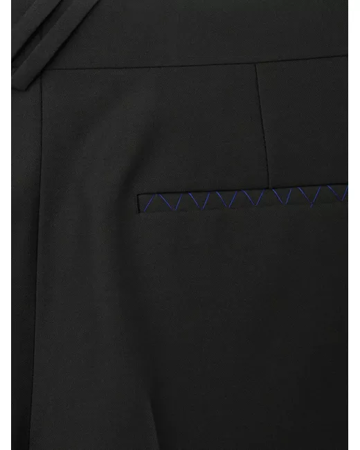 black wool tailored cut pressed crease contrast stitching belt loops concealed front fastening straight leg two side inset pockets rear welt pocket