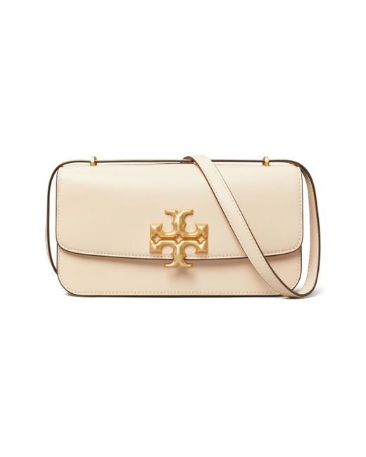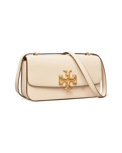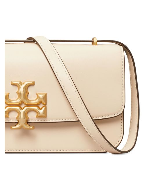 Crafted of rich leather, Tory Burch's Eleanor shoulder bag is highlighted with signature Double T logo hardware. This piece is accompanied by a removable strap for hands-free ease. Removable, adjustable strap Snap closure Goldtone hardware Interior zip pocket Interior slip pocket Calf leather Polyester/rayon lining Imported SIZE 10"W x 7"H x 2.75"D ABOUT THE BRAND Since debuting her brand in 2004, New York-based designer Tory Burch has made an impact on the fashion world with her handbags and shoes, and playful-yet-polished clothing. Today, Burch remains inspired by color and travel, with her vibrant collections bursting with prints, and her instantly recognizable double-T logo drawing from Moroccan architecture. Handbags - Tory Burch Handbags > Tory Burch > Saks Fifth Avenue > Barneys. Tory Burch. Color: New Cream.