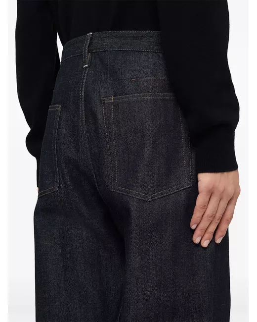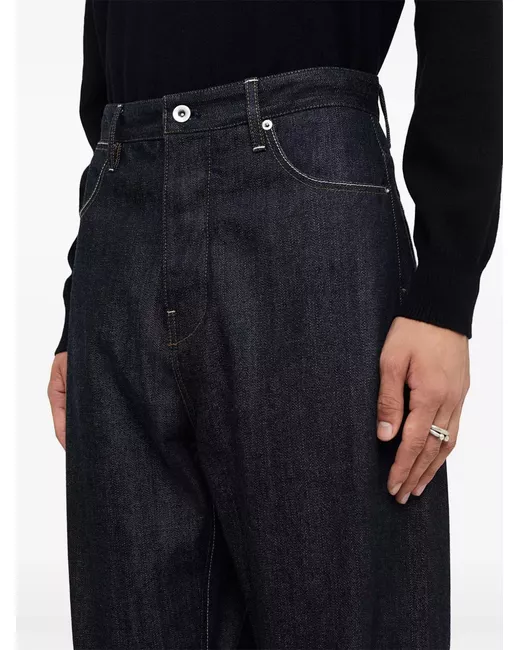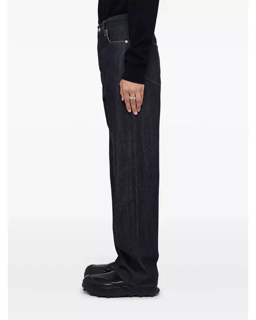 blue cotton denim dark wash contrast stitching straight leg mid-rise classic five pockets belt loops concealed fly and button fastening