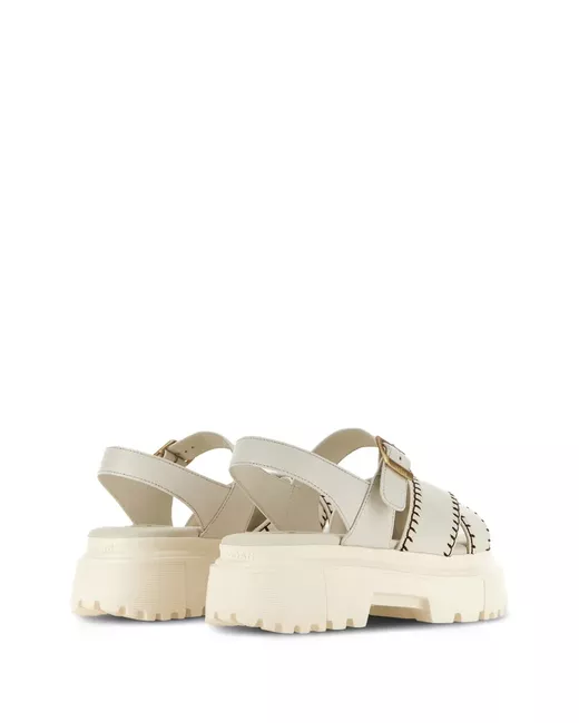 beige leather contrast stitching round open toe crossover strap at the toe branded insole 55mm chunky rubber sole side buckle fastening This piece comes complete with a protective dust bag.