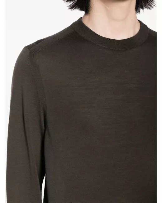 dark green merino wool fine knit semi-sheer construction embroidered logo at the sleeve ribbed trim crew neck long sleeves