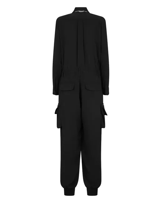 black classic collar front button fastening long sleeves buttoned cuffs two chest flap pockets rear elasticated waistband belt loops two side cargo pockets two rear flap pockets wide leg