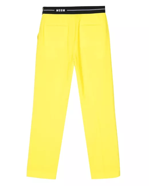 canary yellow stretch-virgin wool crepe texture tapered leg elasticated logo waistband pressed crease two diagonal pockets to the sides two rear jetted pockets branded zip puller concealed side zip fastening