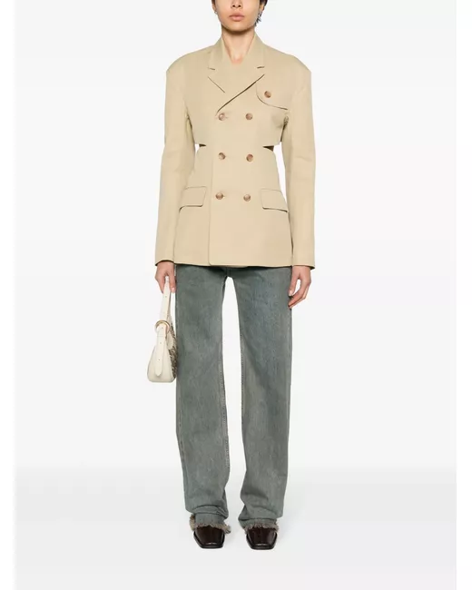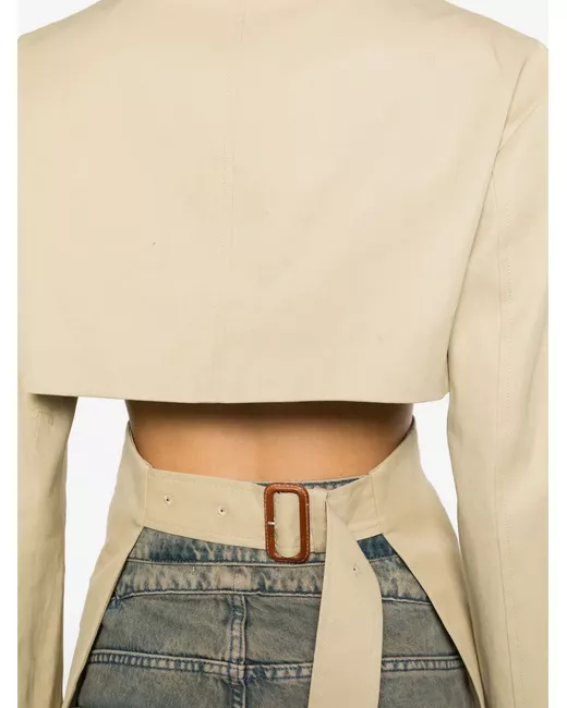 taupe cotton twill weave notched lapels long sleeves two side flap pockets open back with adjustable rear belt straight hem double-breasted button fastening