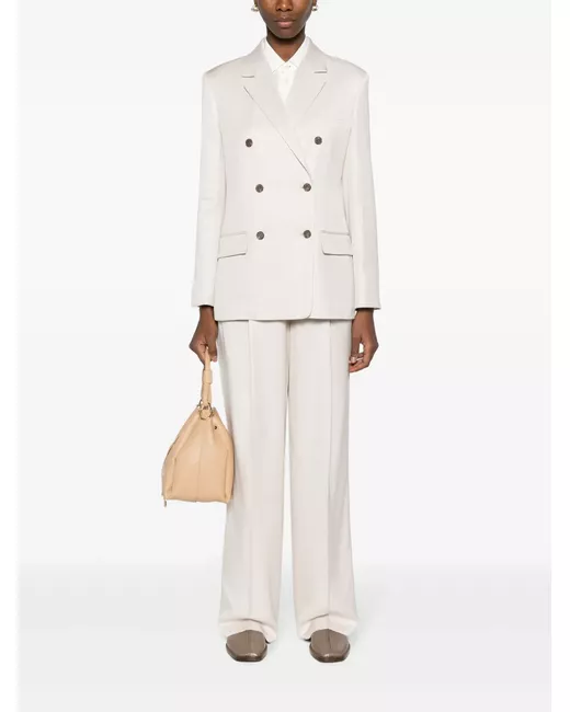 light beige twill weave notched lapels double-breasted button fastening shoulder pads long sleeves buttoned cuffs chest welt pocket two front flap pockets English rear vents straight hem full lining