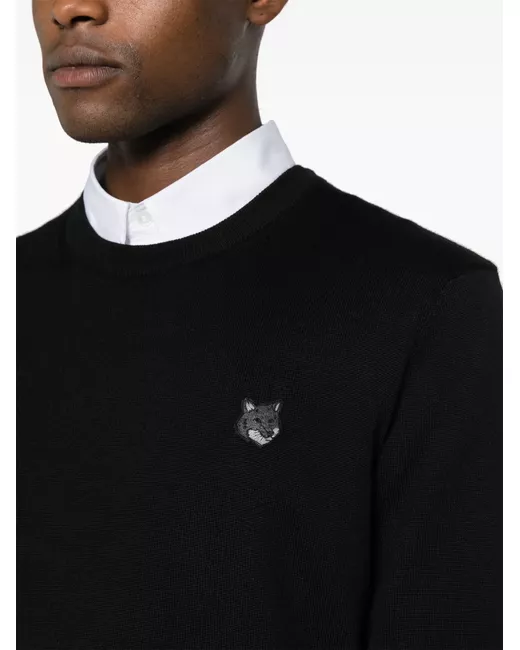 black wool fisherman's knit crew neck long sleeves Fox-head patch at the chest ribbed trim