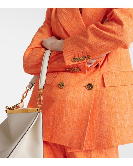 Material: 86% viscose, 14% polyester. Care instructions: dry clean. Made in Italy. Designer color name: Orange. Lining: 52% viscose, 48% acetate. Closure: double-breasted (six buttons). Pockets: flap pockets.