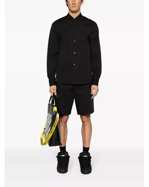 black cotton poplin texture embroidered logo to the front wrap-around strap collar front button fastening long sleeves buttoned cuffs curved hem