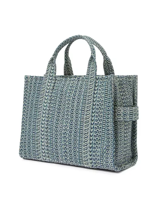light blue cotton denim monogram pattern logo patch to the front two top handles adjustable detachable shoulder strap single flat side handle top zip fastening main compartment internal zip-fastening pocket internal slip pocket