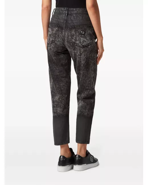 black/grey cotton washed denim distressed effect logo patch to the rear high waist front button and zip fastening belt loops classic five pockets tapered leg cropped leg straight hem